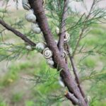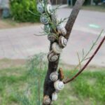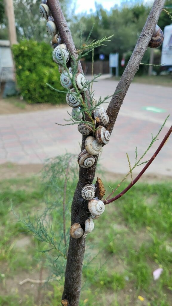 Die Schnecken auf dem Bild haben sich höchstwahrscheinlich zum Schutz vor der Sonne und Trockenheit am Strauch „hochgezogen“. Das nennt man Ästivation – eine Art Sommerruhe.