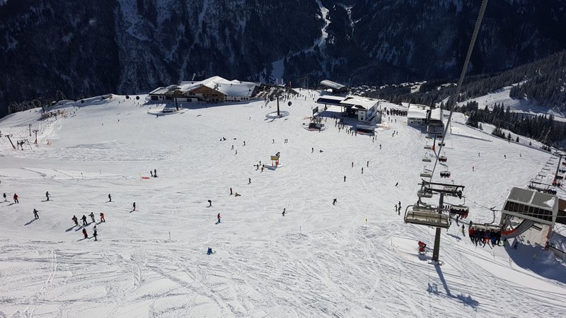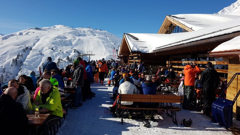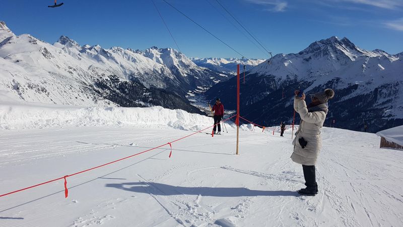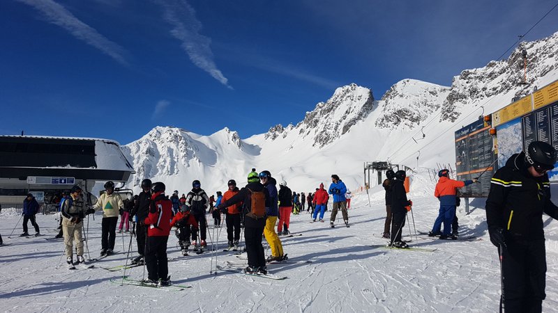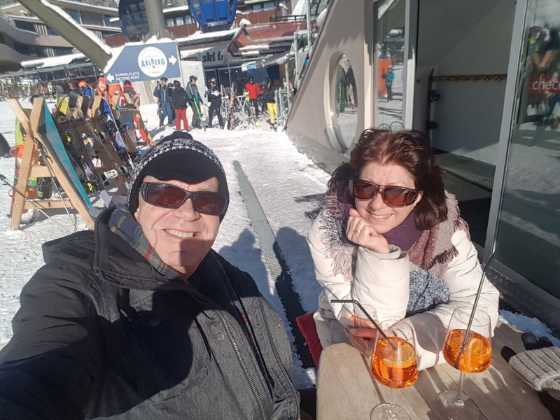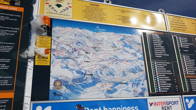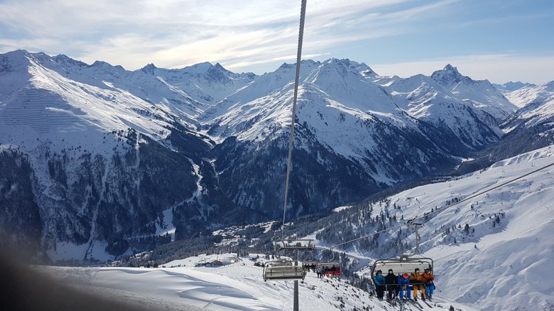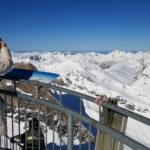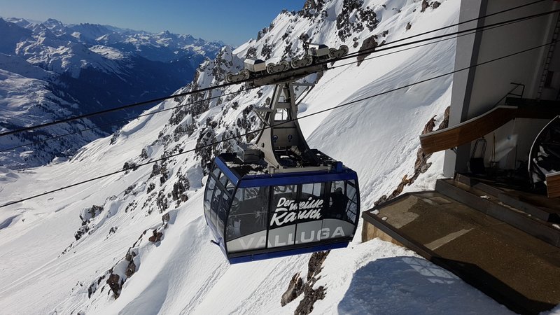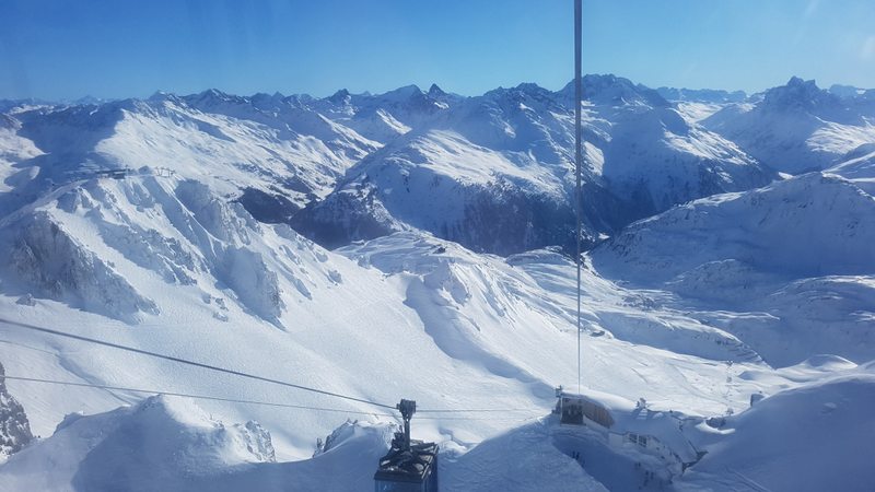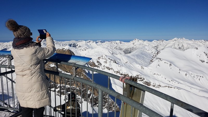 Wir beschliessen erst gegen Mittag nach St. Anton zu fahren. Den dann ist der grosse Run der aktiven Ski- und Snowbordfahrer auf den Pisten. In St. Anton besteigen wir die Gondelbahn zum Vallugagipfel. Das heisst 3x umsteigen, bis wir auf 2811 m ü.M. sind. Das Panorama da oben ist einfach phänomenal. Berge, so weit das Auge reicht.