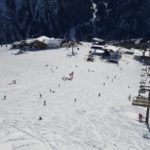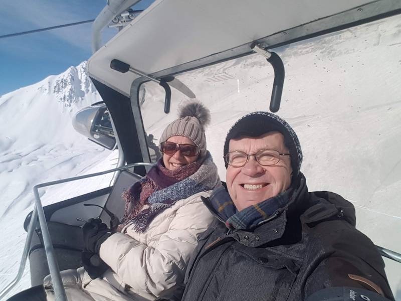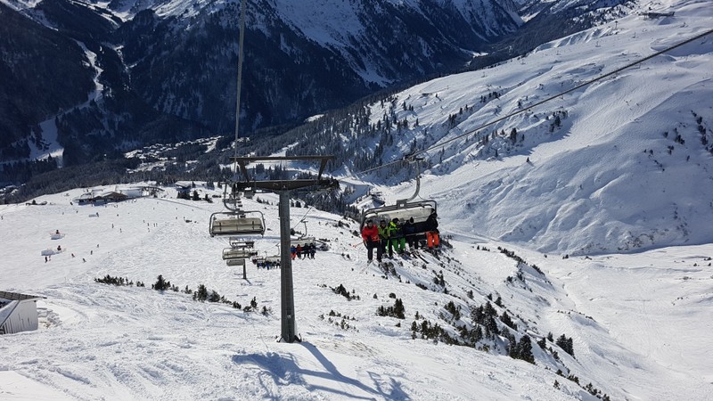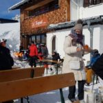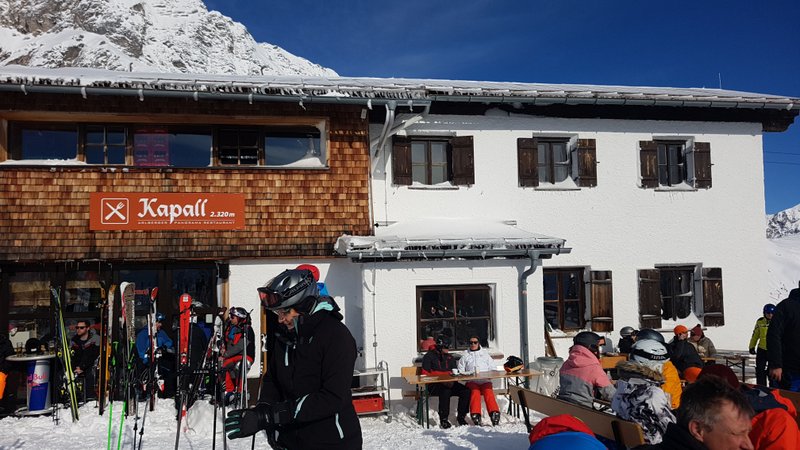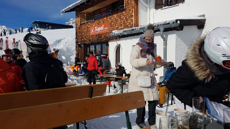 Also lösen wir ein Ticket via Zwischenstation Gampen. Da wir das Skifahren schon vor Jahren aufgegeben haben, sind wir als „Fussgänger“ richtige Exoten. Bis zur Mittelstation gehts mit 8er-Gondeln, ab da sind es 6er-Sessellifte. Ein riesiger Haufen Ski- und Snowboerdfahrer wartet schon. Kurz die Lage überblickt, super, es gibt eine eigene Kolonne für Fussgänger, und wir sind die Einzigen. Links an den vielen Schneesportlern vorbei bis nach vorne. Der Mitarbeiter der Bahn begrüsste uns mit den Worten: „Heute werden keine Fussgänger mitgenommen“!! Oh Schock, aber wir haben doch das Ticket bis nach oben schon bezahlt! Er sieht uns mitleidend an und meint, „kein Problem ihr könnt trotzdem rauf“. Er stoppt die Bahn kurz und lässt uns aufsteigen. Wie gesagt, wir sind EXOTEN! Und die einzigen Fussgänger auf dem Kappal. Wir gehen zum obigen Restaurant und suchen uns draussen einen sonnigen Platz und geniessen einen Jagertee.