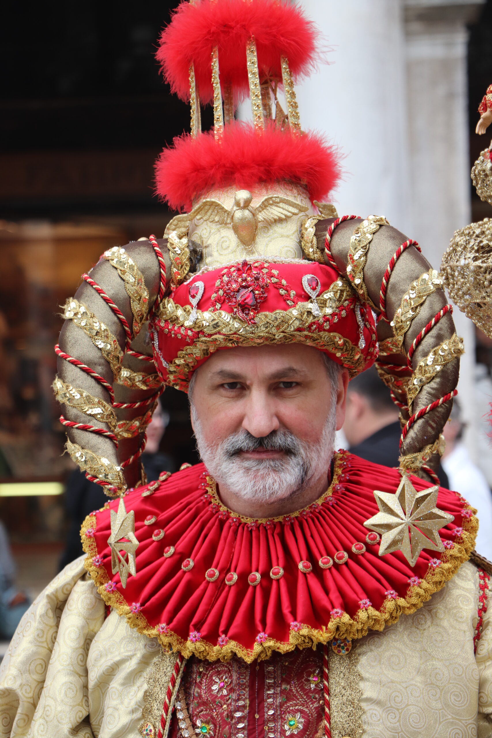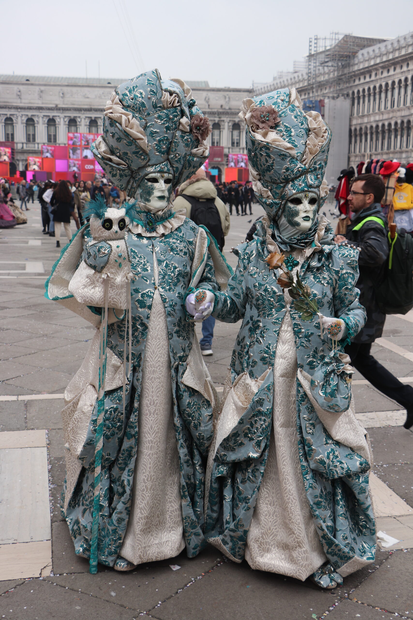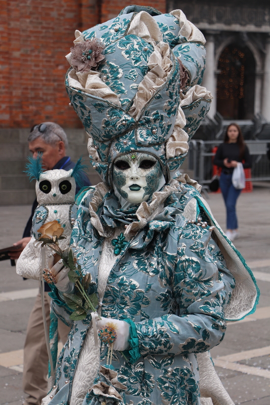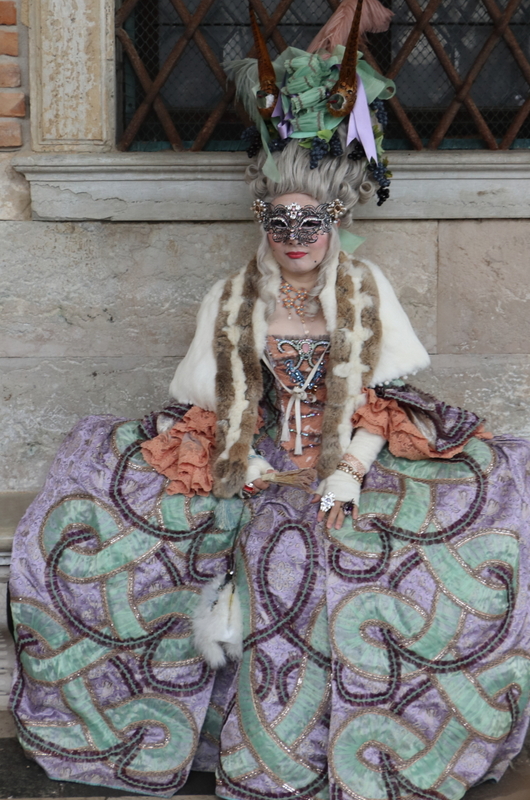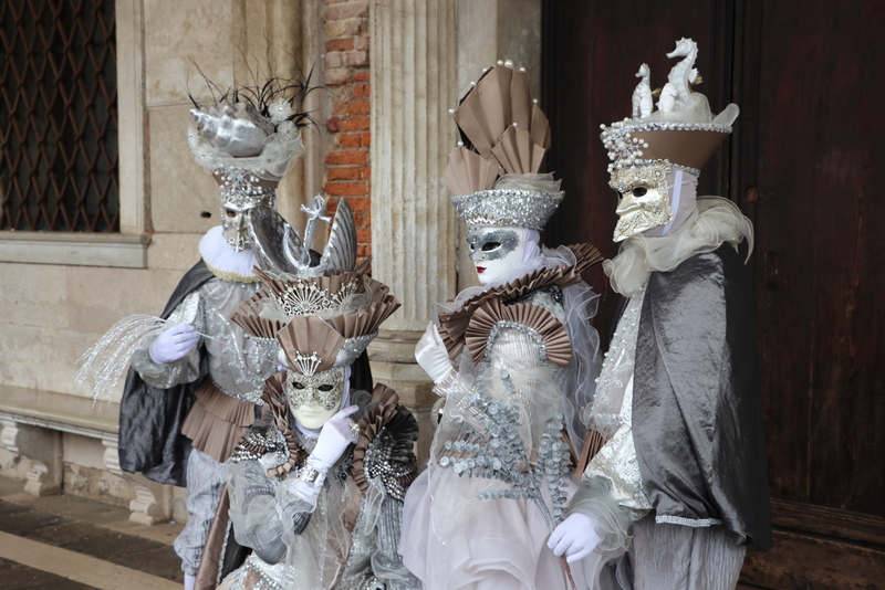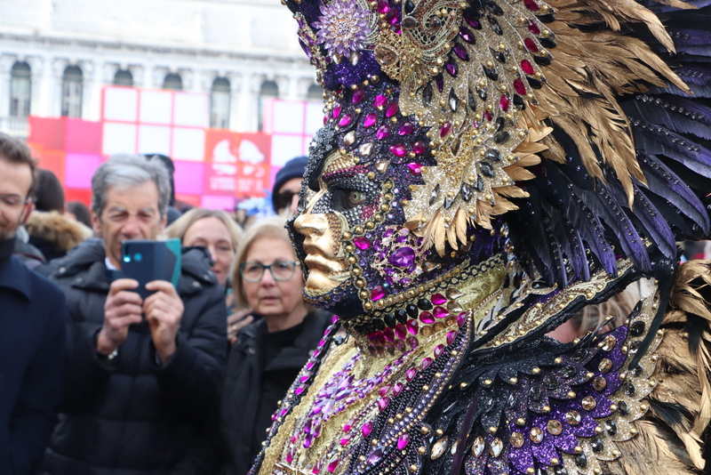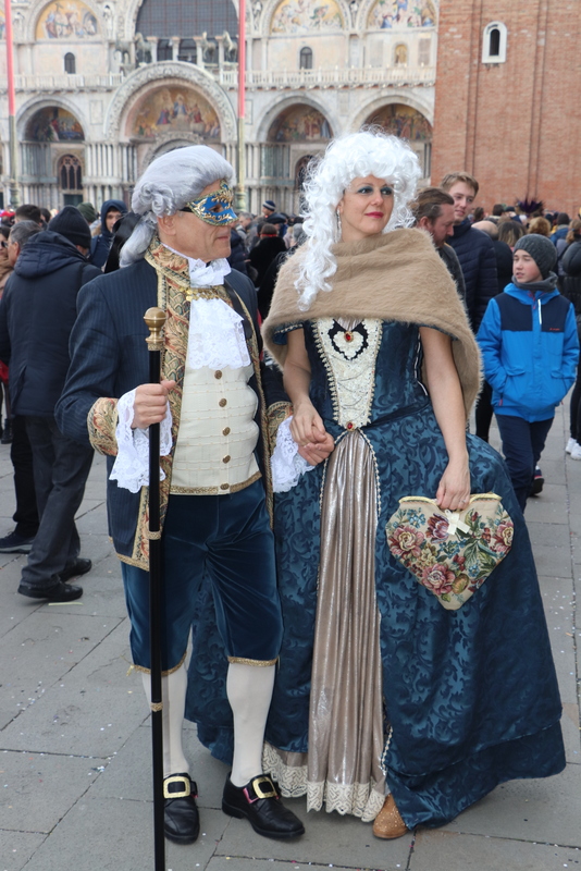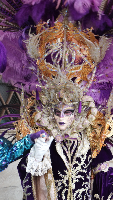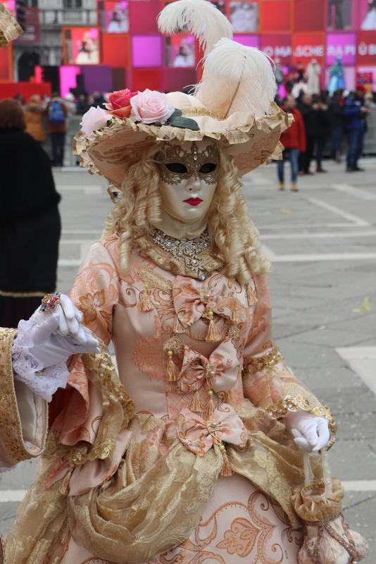 Nach dem 3-stündigen Stadtrundgang kehren wir wieder zum Hotel zurück und ziehen unsere Kostüme wieder an und ab zum Markusplatz. Kaum angekommen, werden wir von hunderten Kameras und Handys festgehalten. Auffällig ist, dass die meisten Besucher sich gerne zwischen uns stellen und so fotografiert werden wollen. Sie zeigen sich dabei überglücklich. Bei den oppulent Kostümierten, sieht man das eher selten. Einfach ein tolles Gefühl, so bewundert und bestaunt zu werden.