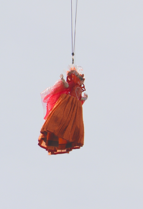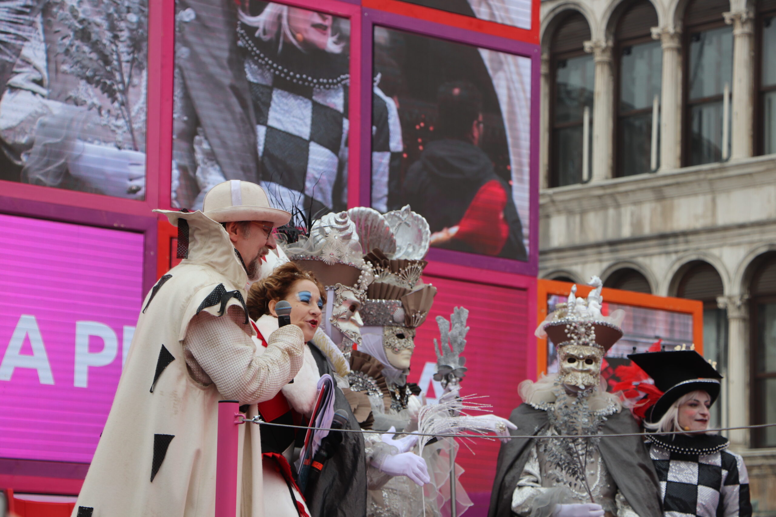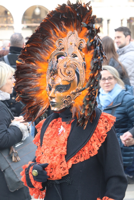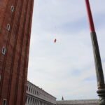 Aber der Karnevals-Gott meint es gut mit uns. 5 vor 12 sind wir angekommen. Leider nicht an der optimalen Stelle, aber wir sind da und sehen den Engelsfflug vom Campanile. Ein Engel schwebt vom Turm langsam auf den Markusplatz herunter