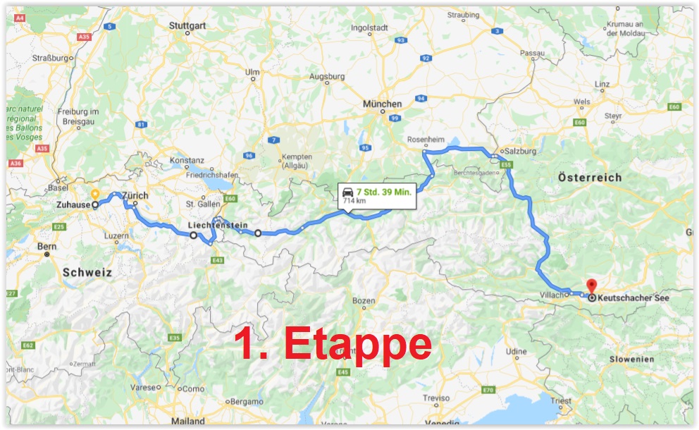 Samstagmorgen, 9:30 Uhr, alles war gepackt für die Reise. Los ging’s auf der Autobahn Richtung Zürich. Über Bad Ragaz, durch das Fürstentum Lichtenstein und den Arlberg-Strassentunnel erreichten wir Innsbruck. Unser erstes geplante Etappenziel war der Campingplatz in Rasun Anterselva in Italien. Dazu hätten wir über den Brennerpass in Richtung Bozen fahren müssen. Unser Navi warnte uns vor einem grossen Stau am Brennerpass. Da wir zeitlich sehr gut unterwegs waren, haben wir uns entschlossen unser zweites Etappenziel, einen Campingplatz am Keutschachersee in Kärnten (Österreich) anzufahren.