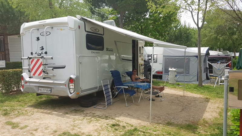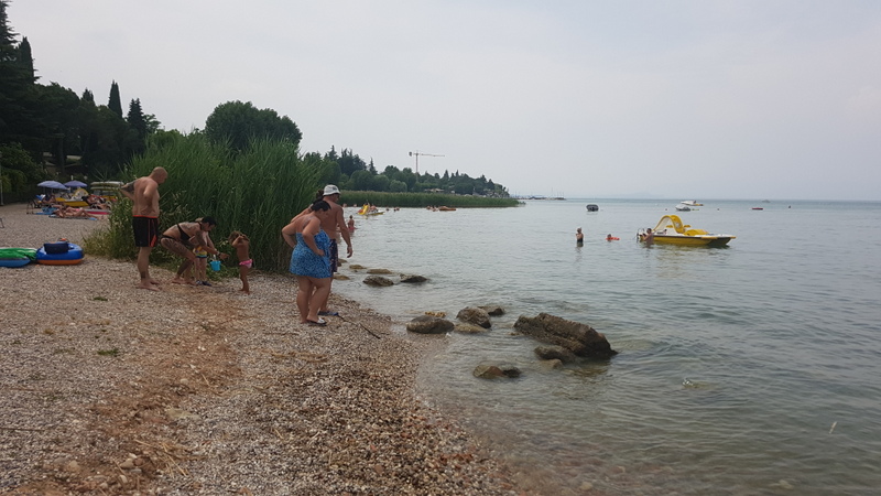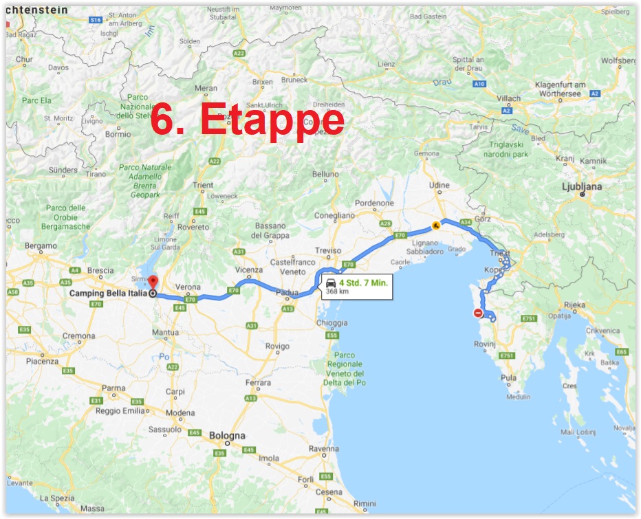 Miitlerweilen war es Sonntag, am Montag hiess es frühzeitig aufbrechen, damit wir nicht das gleiche Schicksal wie diejenigen vom letzten Sonntag (Stau) erleiden mussten. Also fingen wir am Nachmittag an unser Womi mit all seinen Utesilien zusammen zu packen und zu verstauen. Montagmorgen, 8:40 Uhr, verliessen wir den Campingplatz und machten uns auf den Weg nach Italien. Die (berüchtigte) Grenze zwischen Kroatien und Slowenien passierten wir in sagenhaften 15 Minuten. Zum Glück hatte ich bei der Ankunft in Kroatien unser Dieseltank bereits gefüllt, so konnten wir die knapp 400 km bis Pesciera del Garda durchfahren. Damit wir keine Wartezeiten bei den italienischen Autobahnzahlstellen zu befürchten hatten, besorgte ich uns beim TCS vorgängig einen TELEPASS-Sensor. Das erlaubte uns durch die separaten TELEPASS-Spuren auf die Autobahn ein- und aus zufahren. Die Kosten dafür wurden mir direkt meiner Kreditkarte belastet. Kurz vor 12:00 Uhr erreichten wir den 5 Sternen ***** Campingplatz “Bella Italia”. Vor ca. 20 Jahren waren wir schon mal hier, mit einem gemieteten Wohnwagen. Es hat sich viel verändert, kleinere Parzellen und was am markantesten war, in den WC’s der Sanitäranlagen gab es kein Toilettenpapier mehr. Man musste vor der “Sitzung” sich das Papier an einem zentralen Ort ab einer grossen Rolle besorgen. Das heisst, vorher berechnen wieviel Papier man brauchen würde. Ab der zweiten “Sitzung” wurde in der Regel mehr Papier besorgt als nötig! Danach suchte man vergebens nach Seife um sich die Hände zu waschen, ganz zu Schweigen sie zu trocknen. Wasser gab es alledings! Dies war beim ersten Besuch vor 20 Jahren noch nicht so! Es wunderte uns, dass der Platz fast ausgebucht war. Auf jeden Fall waren wir zum letzten Mal auf diesem Camping- platz. Wir genossen den restlichen Tag jedoch trotzdem.
