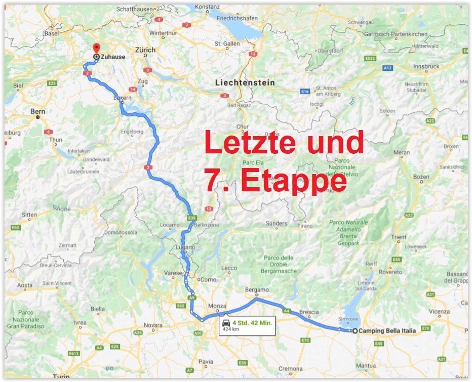 Am Diestagmorgen, nach einem ausgiebigen Frühstück, fuhren wir nun Richtung Heimat. Ohne Probleme oder Staus liessen wir Mailand, den Zoll und den Gotthard-Strassentunnel hinter uns und erreichten am frühen Nachmittag nach total 1955 km unser Zuhause.